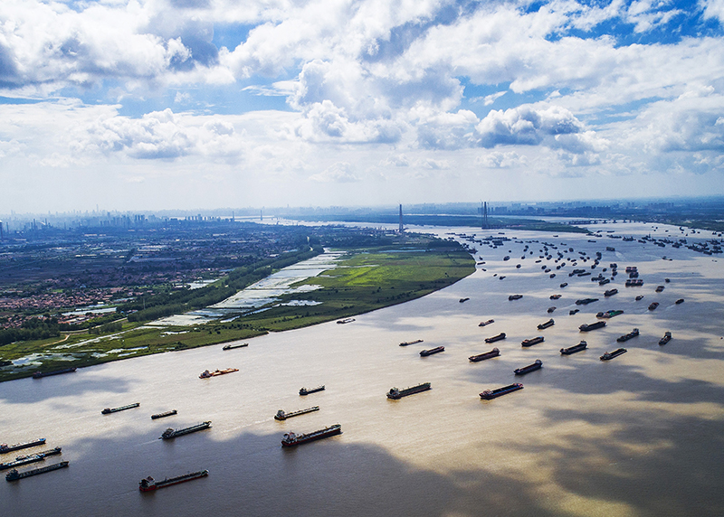船舶在湖北省武漢市陽邏港區(qū)水域行駛(2018年8月13日攝,無人機照片)。新華社記者 肖藝九 攝